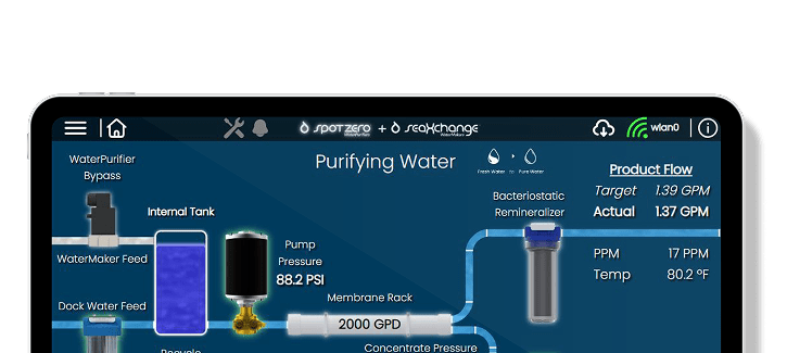 Spot Zero’s Bluelink technology is a marine water management system that uses a combination of a Bluelink Touchscreen, Bluelink Core, and Bluelink Cloud to provide remote access, live software updates, and advanced diagnostics for Spot Zero water purification and desalination systems. It allows users to control their water system from any smartphone or tablet, receive real-time troubleshooting support via TeamViewer, and ensures long-term functionality through internet-based software updates. The system is designed to be seamlessly integrated with multifunction displays from leading marine electronics brands such as Garmin and Simrad.