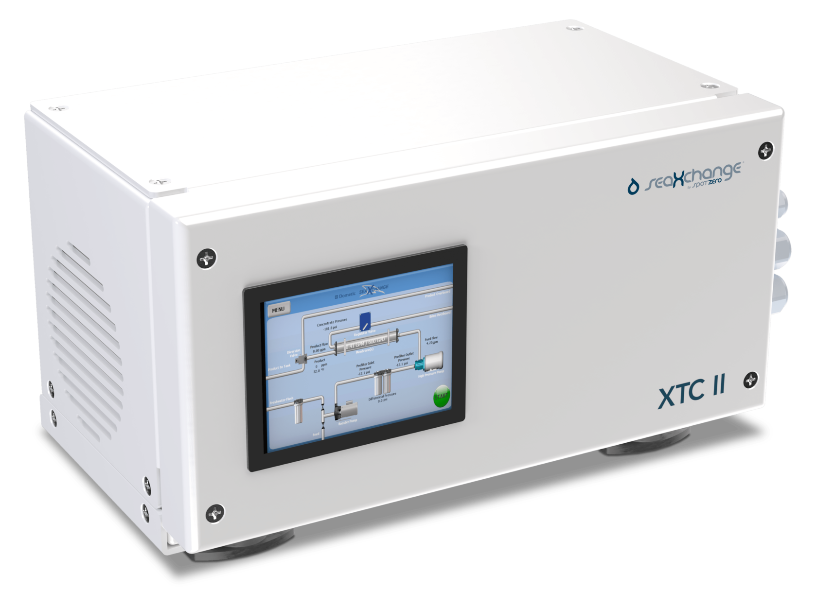 The SeaXchange XTC II Series is the most compact fully automatic seawater reverse-osmosis systems in it's class. It features a fully automatic pressure regulator precisely driven with a stepper motor that regulates and monitors system functions regardless of feed water salinity and temperature without operator intervention. Though fully automated, the XTC II also features an integrated mechanical backup built right into each system. With production capacities up to 2,200 GPD, the XTC II is the perfect desalinator for mid-size to large vessels.