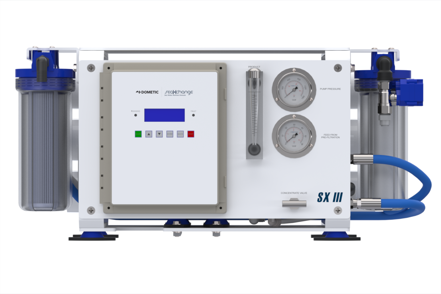 The SeaXchange SXII offers traditional manual functions in an easy to use operation that is powerful, durable, and reliable. Featuring a single pressure adjustment to vary feed water conditions, digital and analog instrumentation for precision accuracy/redundancy and a backlit LCD touch screen display that monitors and provides any operator the know- how to produce water effectively and efficiently. Offered in multiple configurations and production capacities, the SXII is the prefect desalinator for mid-size to large vessels.